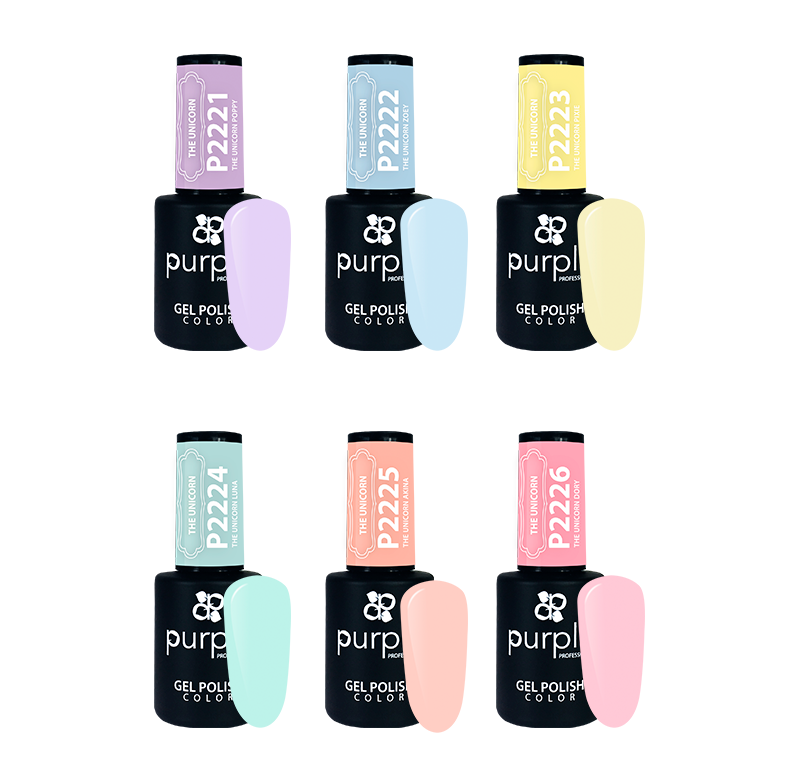 La Colección Unicornio, compuesta por 6 tonos pastel de alta cobertura. Si no sabes qué color elegir, opta por comprar el kit completo con 6 colores.